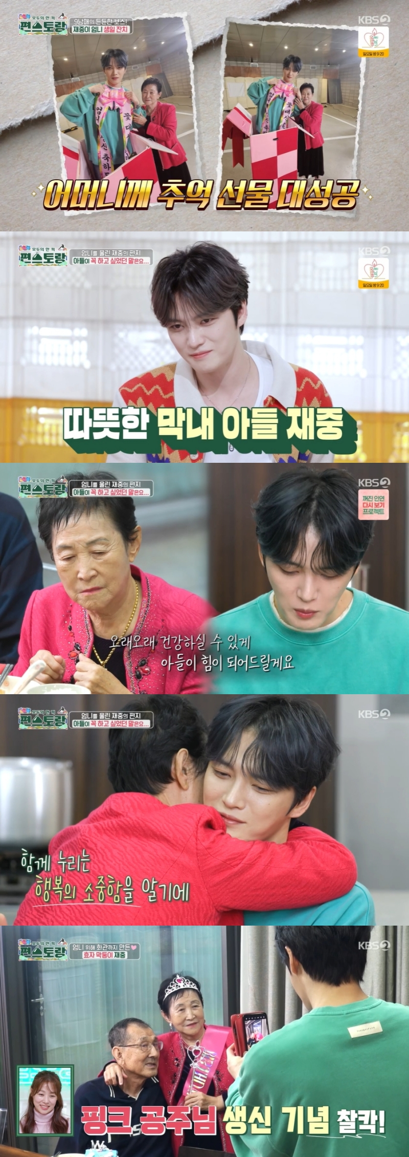 이어 김재중은 어머니에게 직접 만든 화관을 씌워드리고, 손편지도 전했다. 손편지 안에는 "이제 편안하게 사세요. 사랑합니다" 등 아들 김재중의 진심이 가득 담겨 있었다. 어머니는 그런 아들을 꼭 안아준 채 "우리 아들 언제 이렇게 컸어"라며 눈물을 흘리셨다.