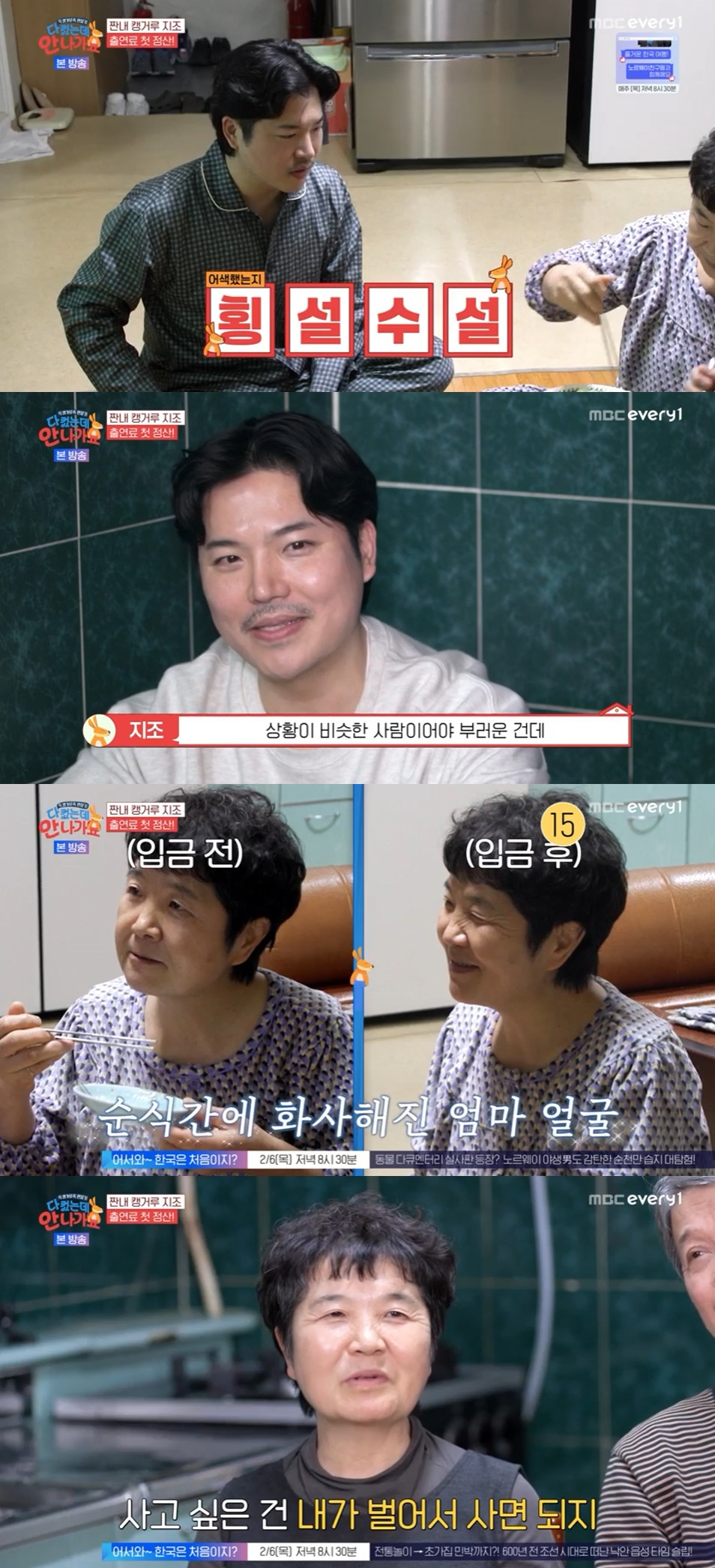 1일 방송된 MBC에브리원, MBN '다 컸는데 안 나가요'에서는 부모님께 첫 출연료를 건네는 지조의 모습이 담겼다.