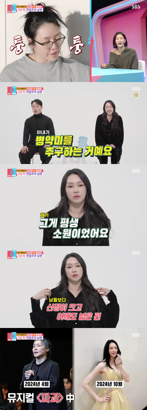 차지연은 "평생 소원이었다"면서 "제가 신장이 크고 어깨도 넓은 편이다. 뮤지컬 처음 시작할 때 '동독 수영선수 같다' '말이 뛰어다니는 것 같다' '너는 장군감이다' '도베르만 같다' 이런 말을 많이 들었다"고 털어놨다.