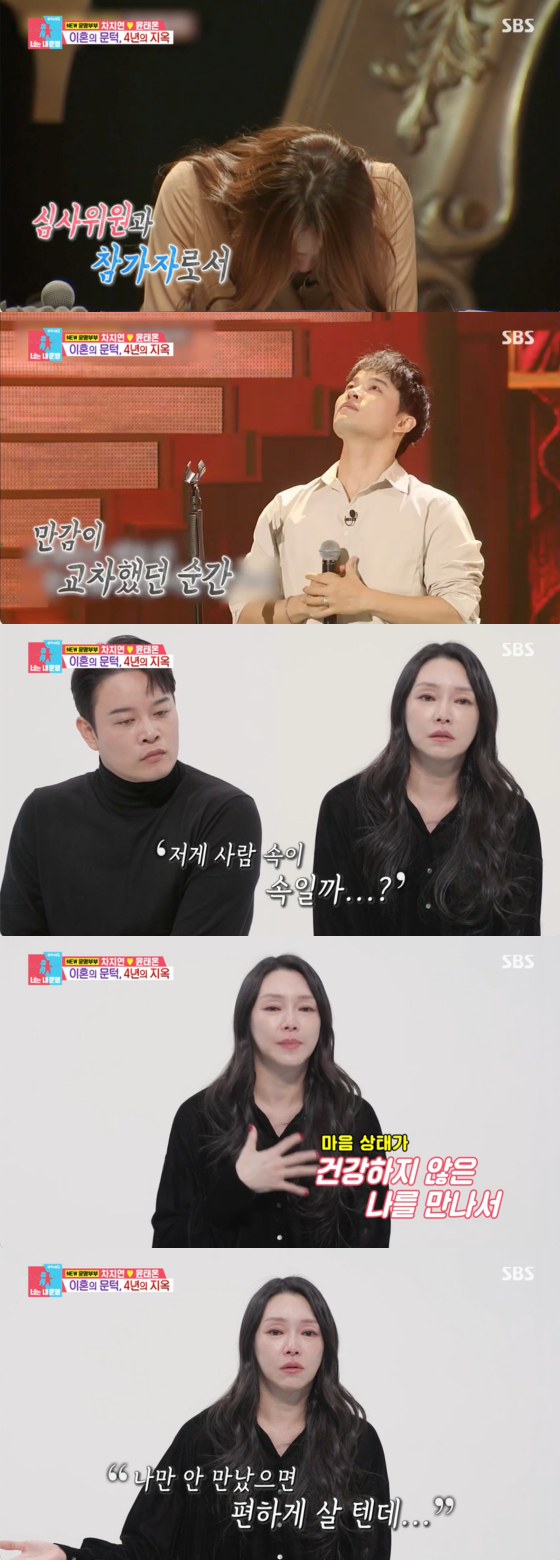 차지연은 "서로 쳐다도 안 보고 지냈을 때 '더블 캐스팅'이라는 오디션 프로그램에 저는 심사위원으로, 남편은 참가자로 출연했다. 그때 남편이 무대 위에 올라오는데 기분이 너무 이상했다. 너무 사랑하는데 너무 미운 마음도 있고, 너무 화가 나는데 너무 잘했으면 좋겠더라. 남편도 나와 이혼을 앞둔 상황에서 나와 눈을 맞추고 노래를 해야 하는데 사람 속이 속일까 싶었다. 그때 굉장히 괴롭고 미안했다"고 회상했다.