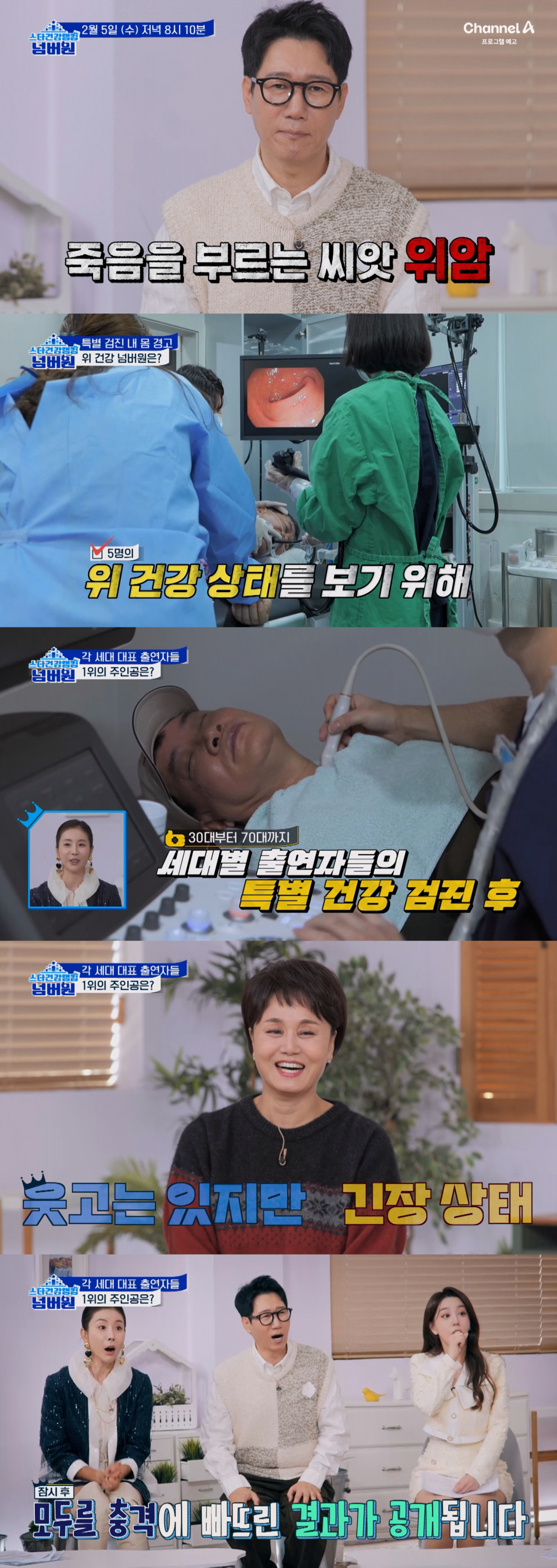 5일 첫 방송 예정인 채널A '스타건강랭킹 넘버원'의 첫 번째 주제는 대한민국 암 발생률 1위인 '위암'이다. 이날 방송에서는 죽음의 씨앗이라고도 불리는 질병인 위암에 대해 알아보고, 출연진들의 위내시경 검진 결과를 바탕으로 스타들의 실제 위(胃) 건강 랭킹이 최초 공개된다.