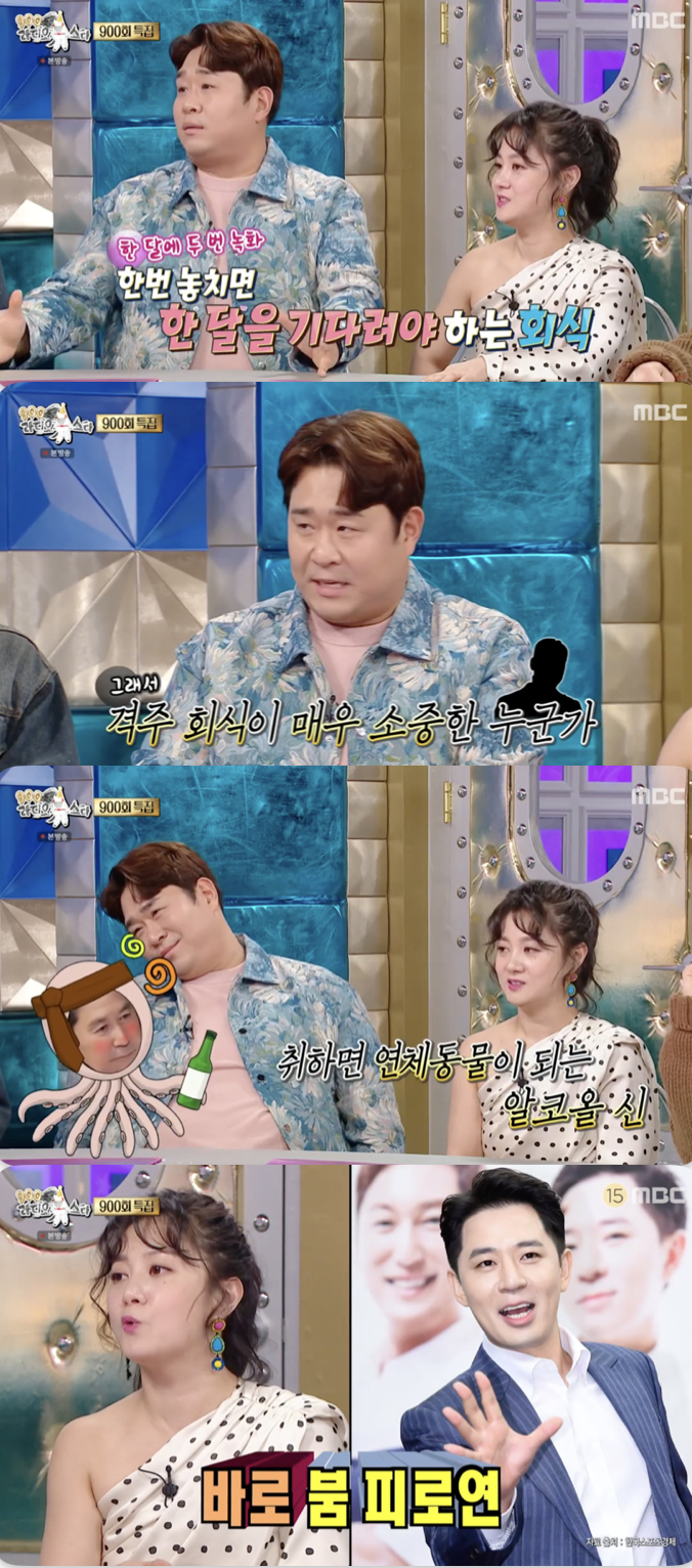 이어 그는 "알코올 신의 보좌관들이 있다. 신동엽을 취할 때 안을 수 있는 주량이 있어야 한다. 취하면 힘을 쭉 빼고 늘어나기 때문. 저랑 넉살, 한해 이렇게 삼각구조로 있다가 피오가 복귀하면서 (4인 체제로) 로테이션이 돌아갈 수 있게 됐다"라고 털어놨다.