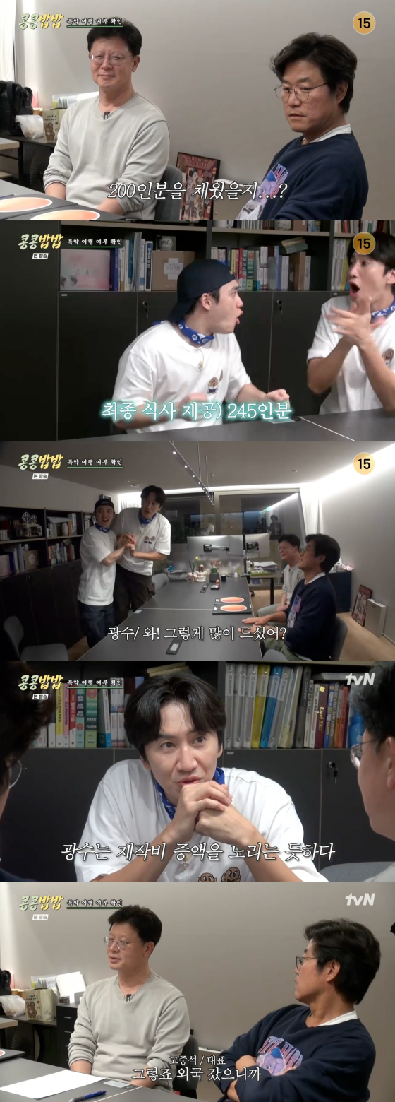 이날 이광수와 도경수는 3일 간의 구내식당 운영을 마치고 특약 이행 여부 확인을 위해 고중석 대표, 나영석 PD와 마주 앉았다.