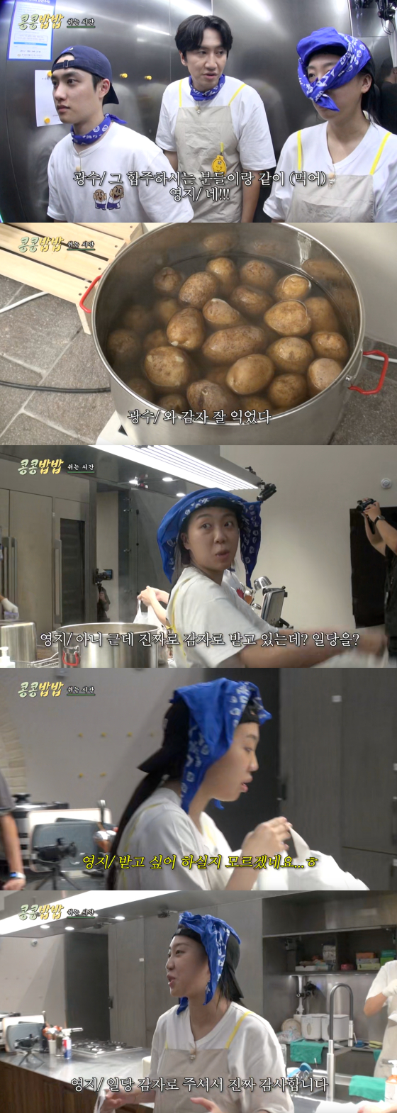 이광수와 도경수는 "감자가 잘 익었다"며 꽤 많은 양의 감자를 이영지에게 건넸다. 이에 이영지는 "아니, 그런데 진짜로 일당을 감자로 받고 있다"며 크게 당황했다.