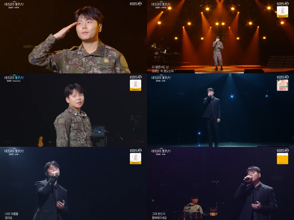이날 '더 시즌즈' 최초로 군복을 입고 등장한 정승환은 오프닝 곡으로 '또 오해영' OST '너였다면'을 불렀다. 정승환만의 울림이 있는 목소리로 진한 여운을 남겼다. 특히, 정승환이 관객석으로 마이크를 넘기자 곧바로 떼창이 터져 나와 눈길을 끌었다.