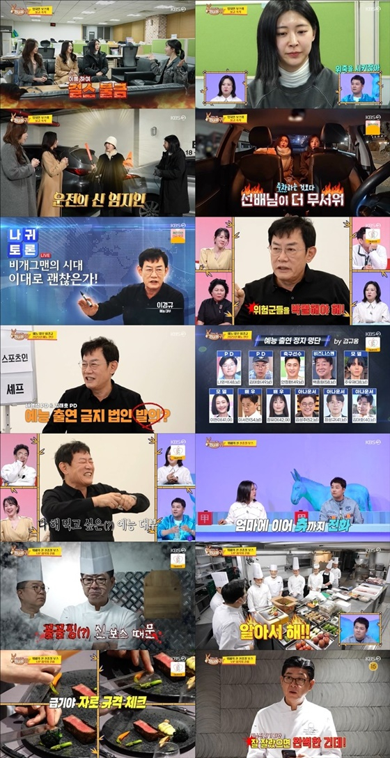 이어 이경규는 "가수는 우리의 아군"이라면서도 "웹툰 작가들은 방송이 본업이 되면 인정"이라고 전했다. 또한 그는 "샘 해밍턴 같은 외국인들은 정보 교류도 되고 큰 피해를 안 준다. 하지만 대상을 받으면 아웃"이라는 말로 웃음을 안겼다. "기업인은 PPL을 제공하시는 분들"이라며 반겼고, 아나운서와 모델에게는 날을 세우면서도 본인 유튜브에 출연한 전현무와 홍진경은 아군으로 분류해 박명수의 원성을 샀다. 배우들 역시 블랙리스트로 분류한 이경규는 최종적으로 나영석, 김태호, 안정환, 백종원, 주우재, 이현이, 이서진, 정유미, 김성주, 장성규, 김대호 총 11명의 예능 출연 정지 대상을 선정하며 "단, 내 유튜브에 출연하면 출연 정지 리스트에서 빼준다"고 말했다. 2025년 예능계 전망을 물으며 "요즘엔 결혼, 이혼 관련 방송이 대부분"이라는 박명수의 말에 깊이 공감한 이경규는 "예능 포맷을 개발하지 않고 출연자의 삶 자체를 가지고 프로그램은 만들면 안 된다"면서도 현재 인기 있는 육아, 이혼 프로그램에 본인이 직접 출연할 계획을 세우는 모습을 보였다.