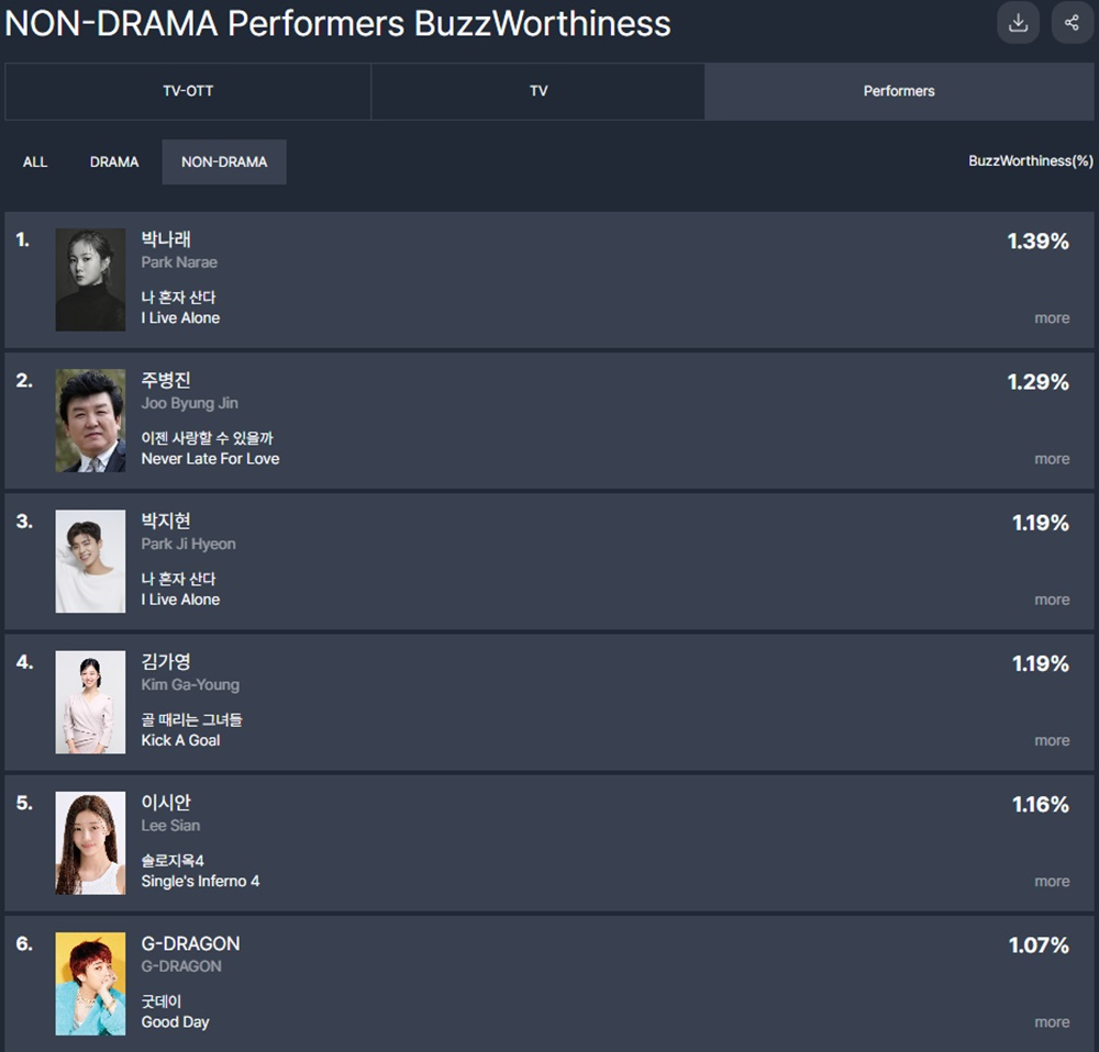 11일 굿데이터코퍼레이션 펀덱스(FUNdex)에 따르면, 박나래는 2월 1주차 비드라마 출연자 화제성 순위에서 1.39%의 점유율로 1위를 기록하는 쾌거를 달성했다.