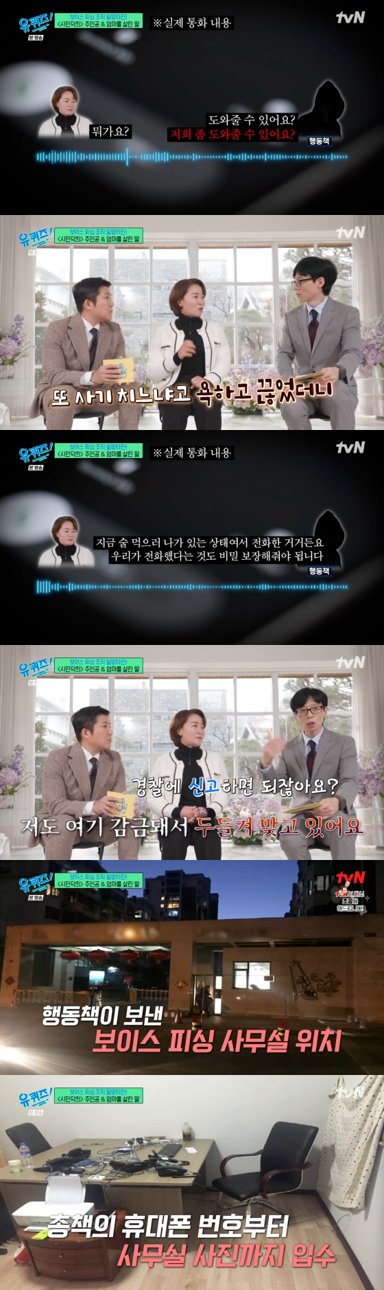 녹취록에서 보이스피싱범은 "우리 좀 도와줄 수 있냐. 총책 잡도록 도와주겠다. 지금 (총책이) 술 먹은 사이에 전화를 한 거다. 우리도 감금돼서 두드려 맞고 있다. 우리는 신고를 하면 바로 걸린다"고 토로해 충격을 자아냈다.