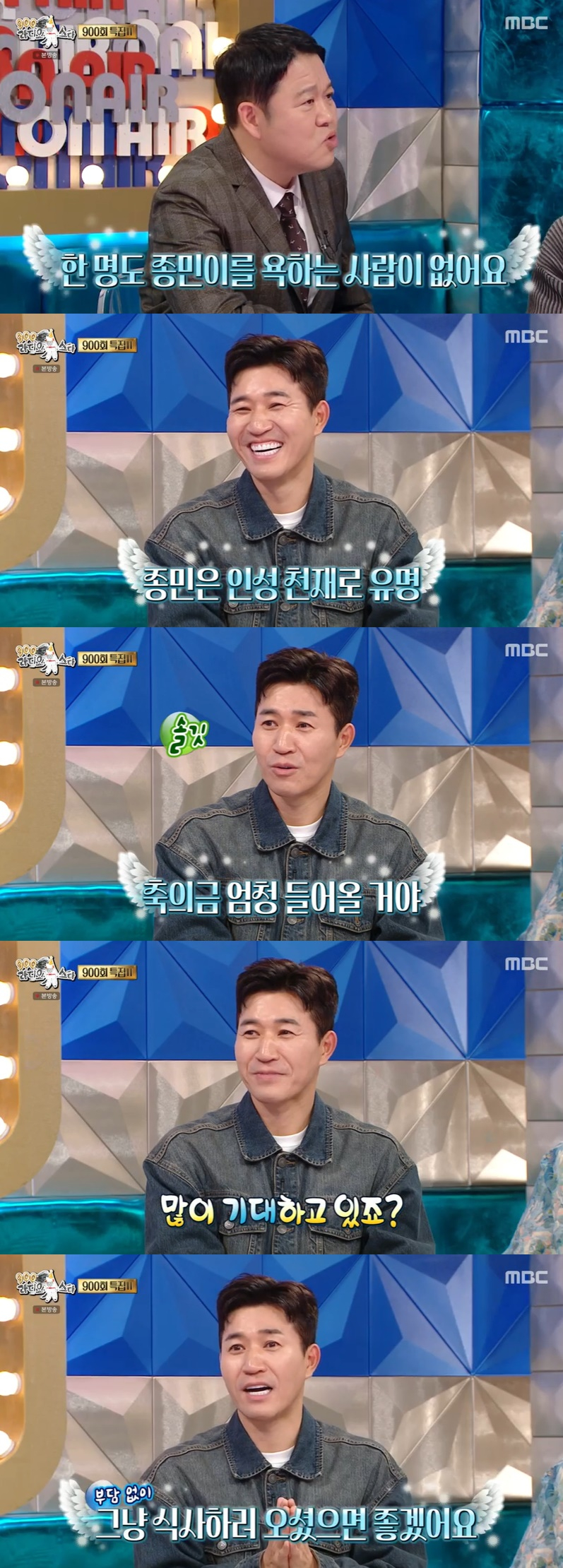 이날 김구라는 "종민이는 내가 다니면서 느낀 게, 한 명도 김종민을 욕한 걸 본 적이 없다. 너무 사람이 좋다고"라고 김종민의 인성을 칭찬했다. 이어 그는 "멍청한데도 욕 먹는 사람이 있는데, 종민이는 누구도 종민이 욕을 한 사람이 없다"라며 "이번에 축의금 엄청 들어올 거다. 진짜로"라고 했다.
