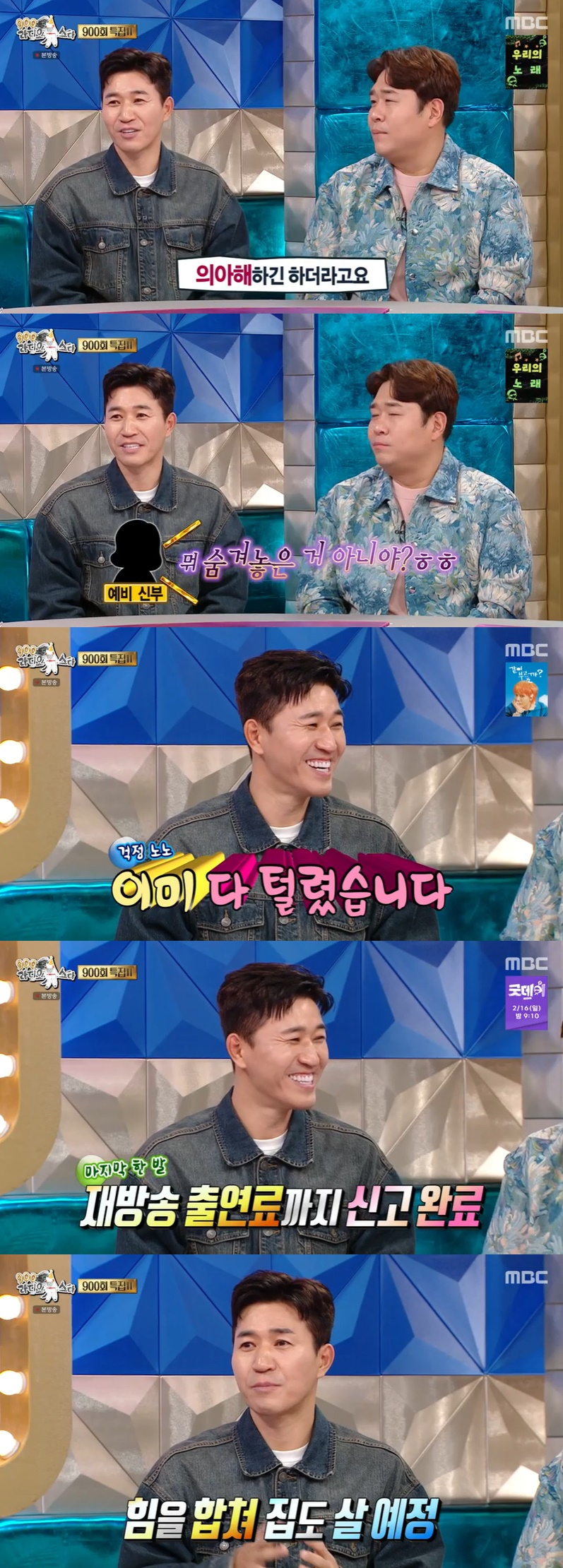 김구라가 "아내가 재정 상태를 아냐"라고 묻자 김종민은 "다 안다. 다 오픈했다"라며 "다 털렸다"라고 했다. 문세윤이 "안 걸린 게 하나 정도 있냐"라고 묻자 김종민은 "재방송료도 다 털렸다"라고 했다.