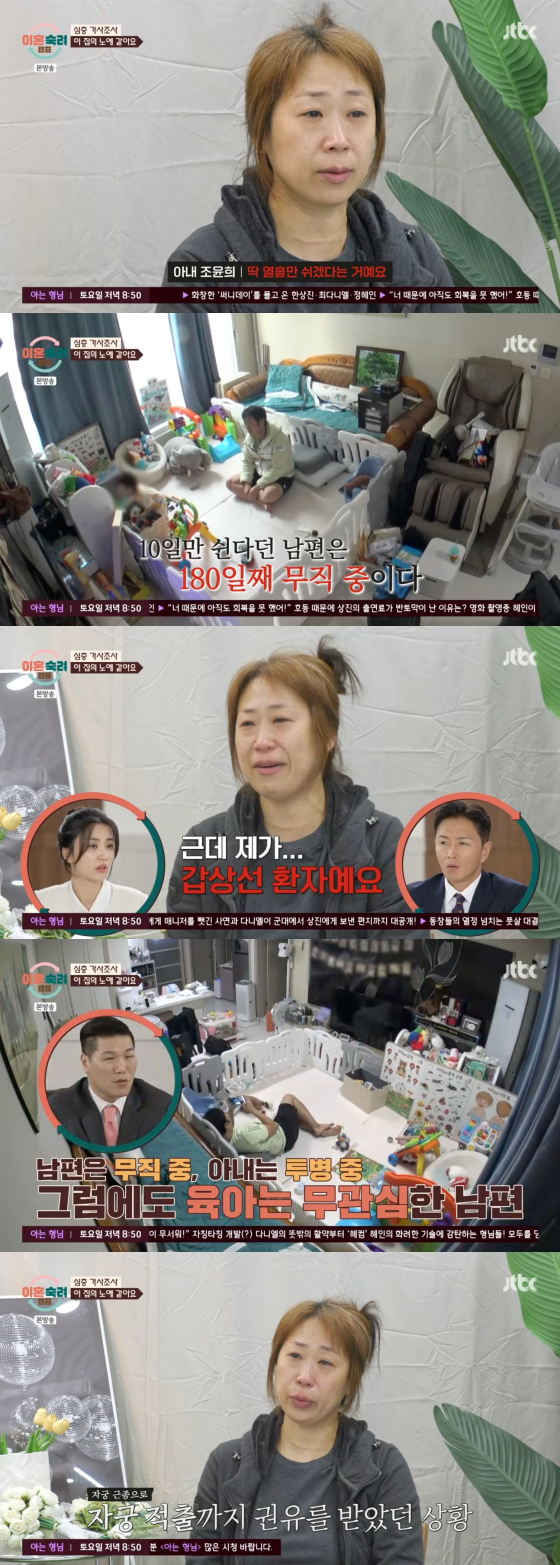 이날 아내는 "남편이 퇴직하고 열흘만 쉬겠다더니 180일째 무직 상태"라며 "저는 갑상선 환자다. 열일곱 살 때 갑상선 수술을 받았다"고 말했다.