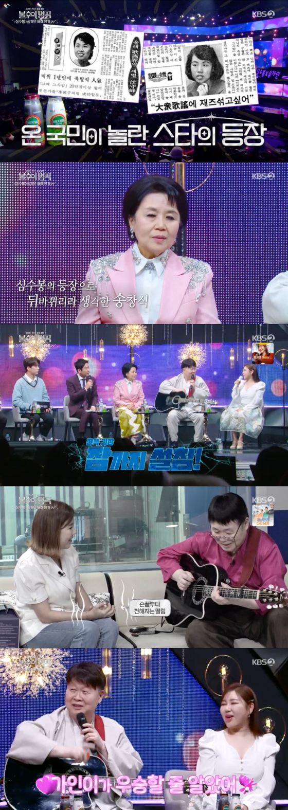 15일 방송된 KBS 2TV 예능 프로그램 '불후의 명곡'은 '신년 기획 4탄: 심수봉, 송가인의 새해 연가' 2부로 꾸며진 가운데 송창식이 게스트로 출연했다.