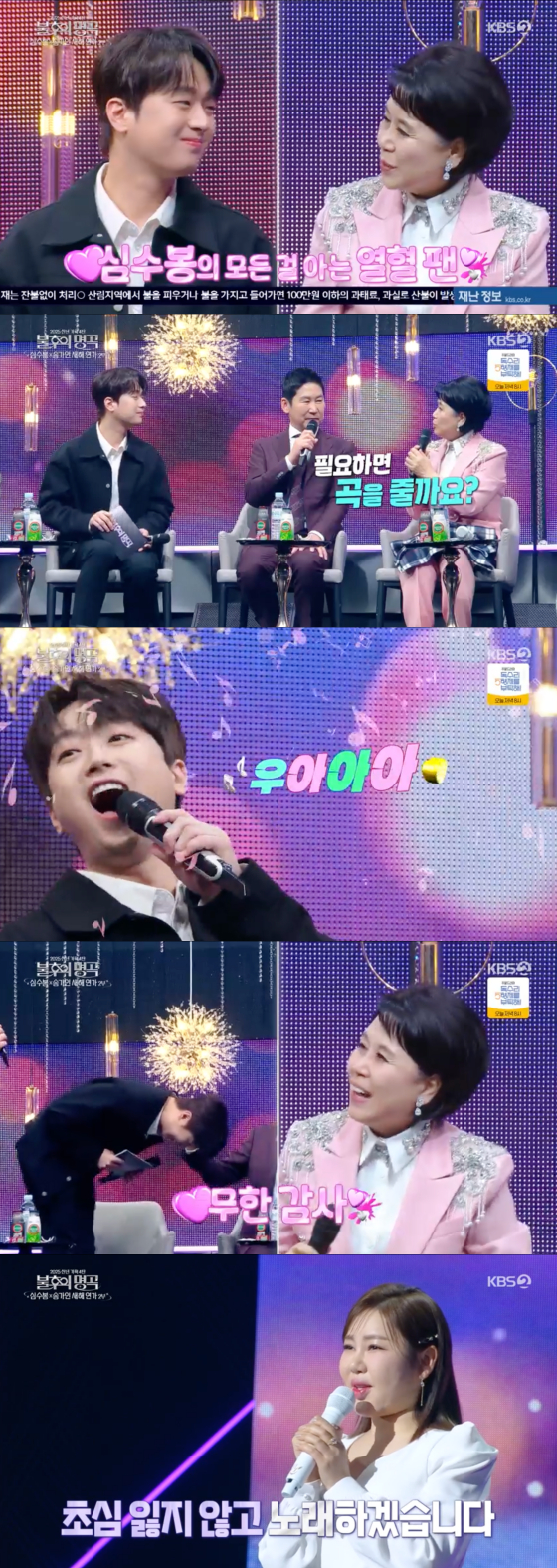 이에 심수봉은 이찬원을 향해 "필요하면 곡을 줄까요"라고 물었고, 이찬원은 환호하며 90도로 인사해 훈훈함을 자아냈다.