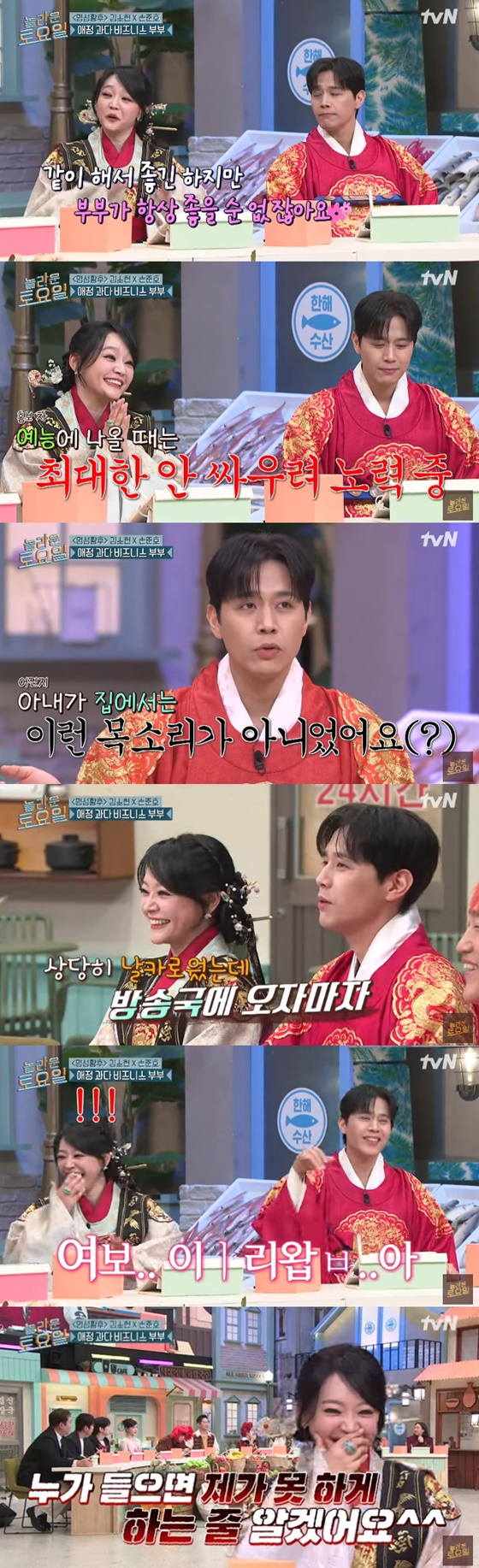 손준호는 "아내가 집에서는 이런 목소리가 아니었다. 방송국에 많은 분이 계시니까 다르다. 집에선 상당히 날카로웠는데 방송국에선 끝에 마무리가 잘 안되는 (애교 넘치는) 목소리"라고 폭로했다.
