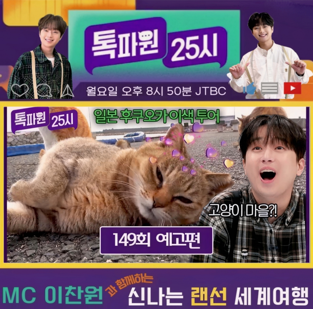 고양이들의 천국이라 할 만큼 곳곳에 고양이들이 등장하자 이찬원을 비롯한 출연자들은 일제히 양손으로 고양이 귀 모양을 만들어 귀엽고 사랑스러운 모습을 연출하기도 했다.