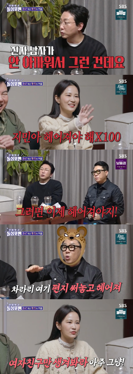 성지인 말을 들은 이상민이 "재력도 김지민이 더 낫지 않냐"고 거들자 김지민은 "내 마음을 이렇게 편하게 해주는 남자는 그 어디에도 없다"고 김준호 편을 들었다.