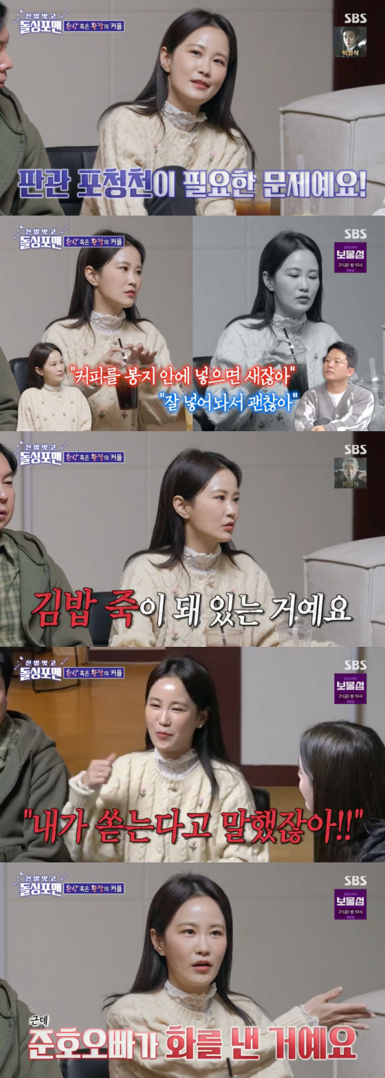김지민은 "너무 화가 나서 '내가 쏟는다고 말했잖아' 하고는 방에 들어가버렸다. 거기서 김준호가 '김밥 갖고 그렇게 화낼 건 아니지 않냐'면서 화를 내더라"고 토로했다.