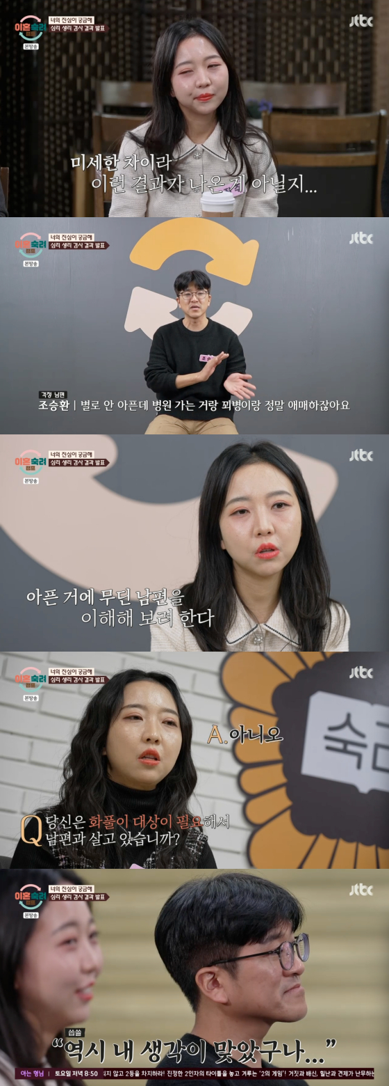 이에 대해 걱정 부부 남편은 "아니오"라고 답했지만 결과는 거짓이었다. 이에 아내는 헛웃음을 터뜨렸다.