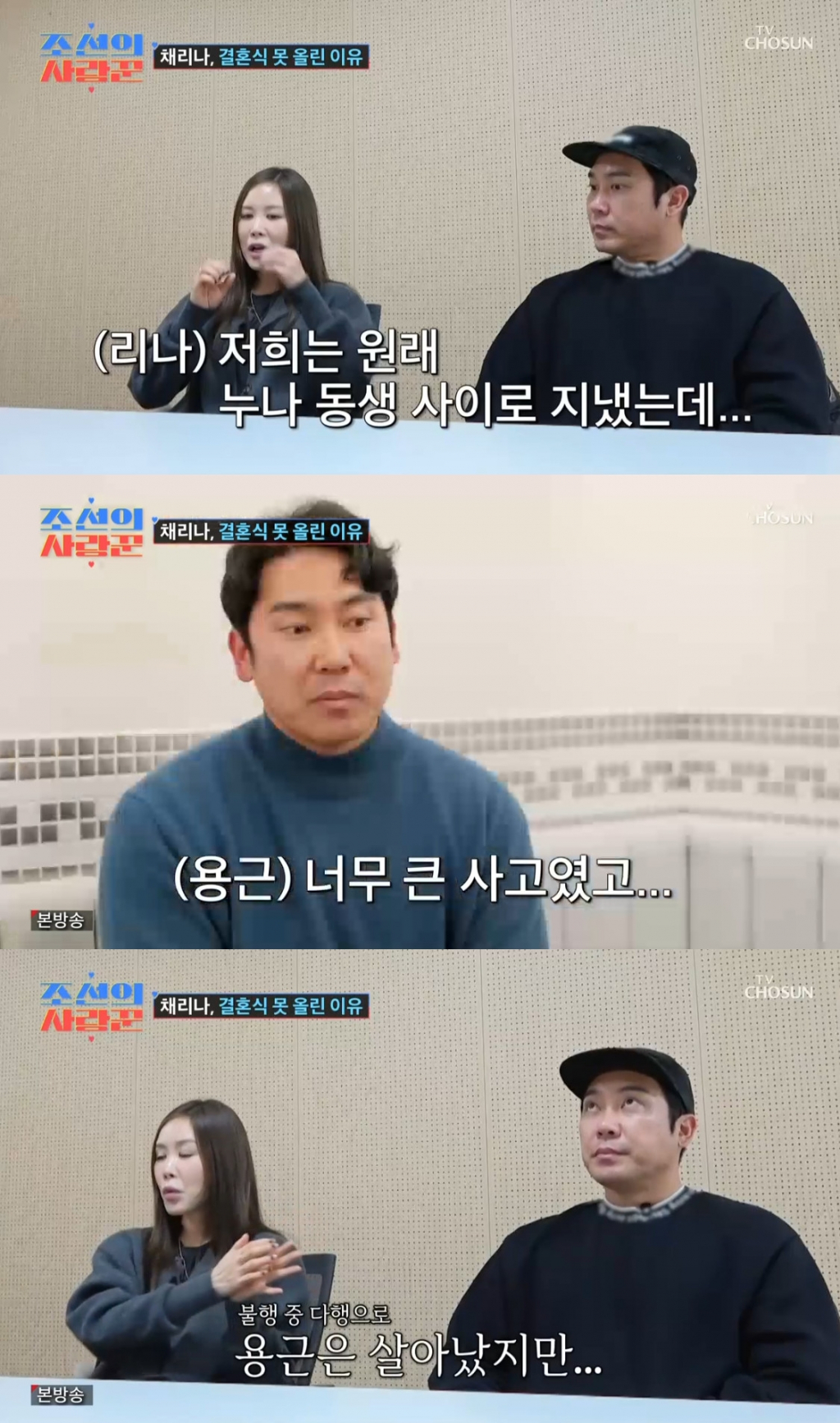 이날 채리나는 "결혼식을 따로 안 했다. 우리는 원래 누나, 동생으로 지내다가 큰 사고 겪고 나한테 마음을 표현했고, 기도 제목이 '이 친구 살려주세요' 였다. 시끄러워지고 싶지 않았다. 피해자가 있으니까"라고 말했다.
