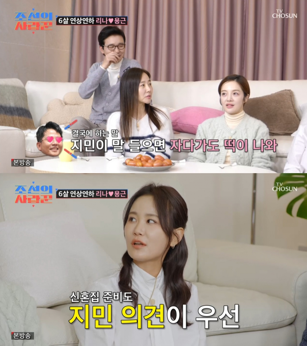 이날 채리나, 박용근 부부 영상을 보던 김지민은 "결정은 항상 내가 한다. 살짝 반항하다가 결국 나한테 맡긴다. 항상 하는 게 '지민이 말 들으면 자다가 떡이 나와' 다. 신혼집 준비도 내 결정이 먼저다"라고 말했다.