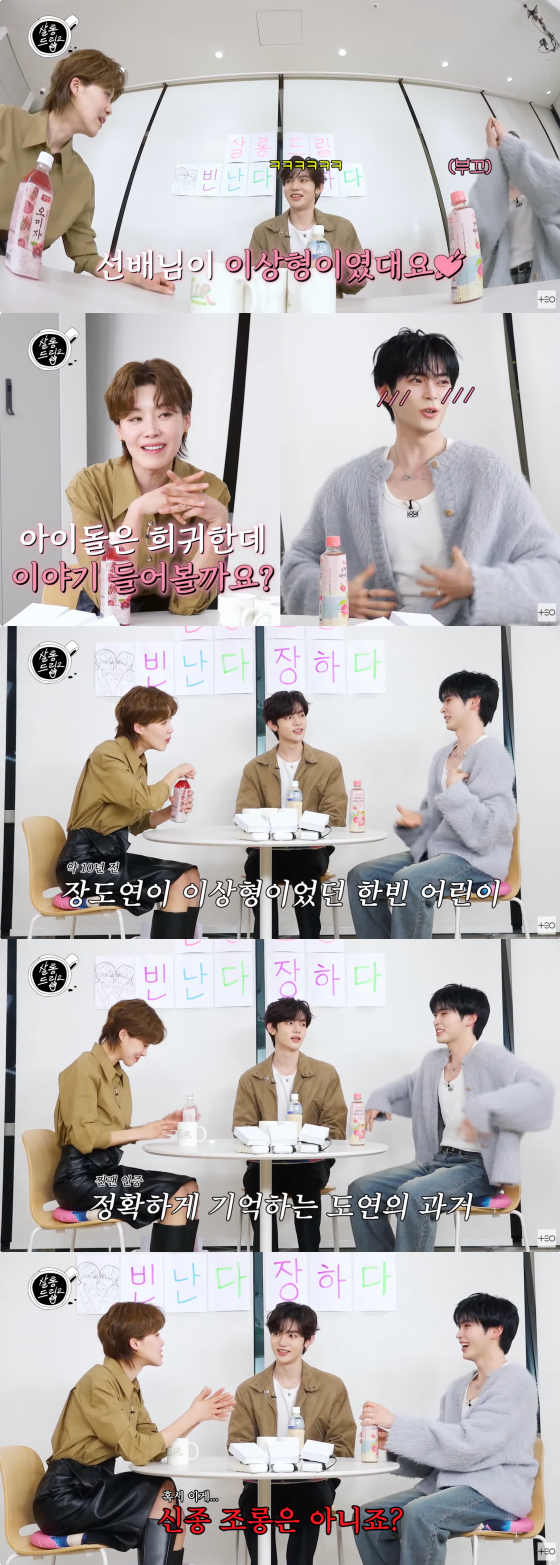 이날 장하오는 MC 장도연을 향해 "저 비밀 하나 있다. (성)한빈이가 옛날에 학교 다닐 때 이상형이 장도연 선배님이었다더라"고 운을 뗐다.