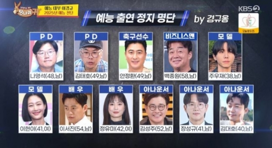 앞서 이경규는 KBS 2TV '사장님 귀는 당나귀 귀'에 출연해 직접 예능 출연 정지 명단 11인을 지정하며 시선을 모았다. 명단에는 나영석 김태호 PD와 안정환, 백종원, 주우재, 이현이, 이서진, 정유미, 김성주, 장성규, 김대호 등이 포함됐다.