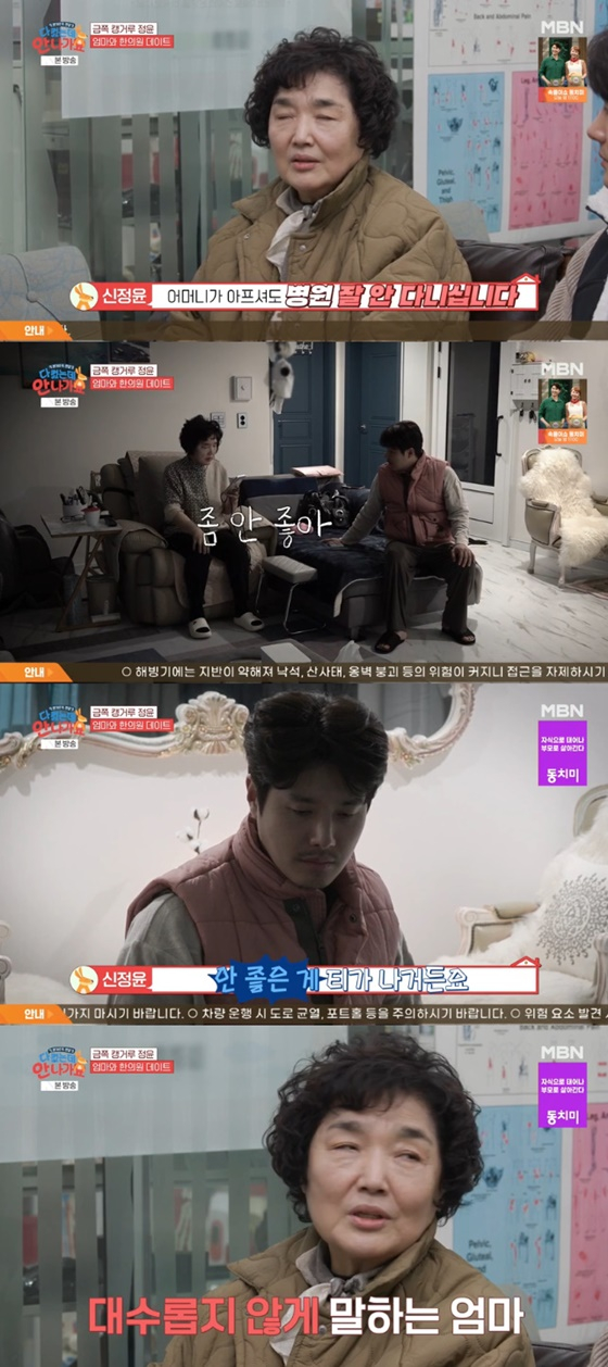 이날 한의원에 도착한 신정윤은 어머니의 건강 상태를 밝혔다. 그는 "(어머니) 무릎 (연골이) 거의 없다"고 밝혔다.