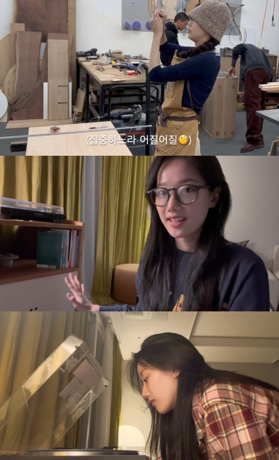 그는 "LP장을 만들어봤다"며 "그전에 책꽂이를 만들어봤는데 가구 만드는 게 정말 매력 있고 재미있더라. 과정을 자세히 담고 싶었지만, 아직 서툴러서 좀 어색한 부분들이 있다. 그래도 예쁘게 봐달라"고 당부했다.