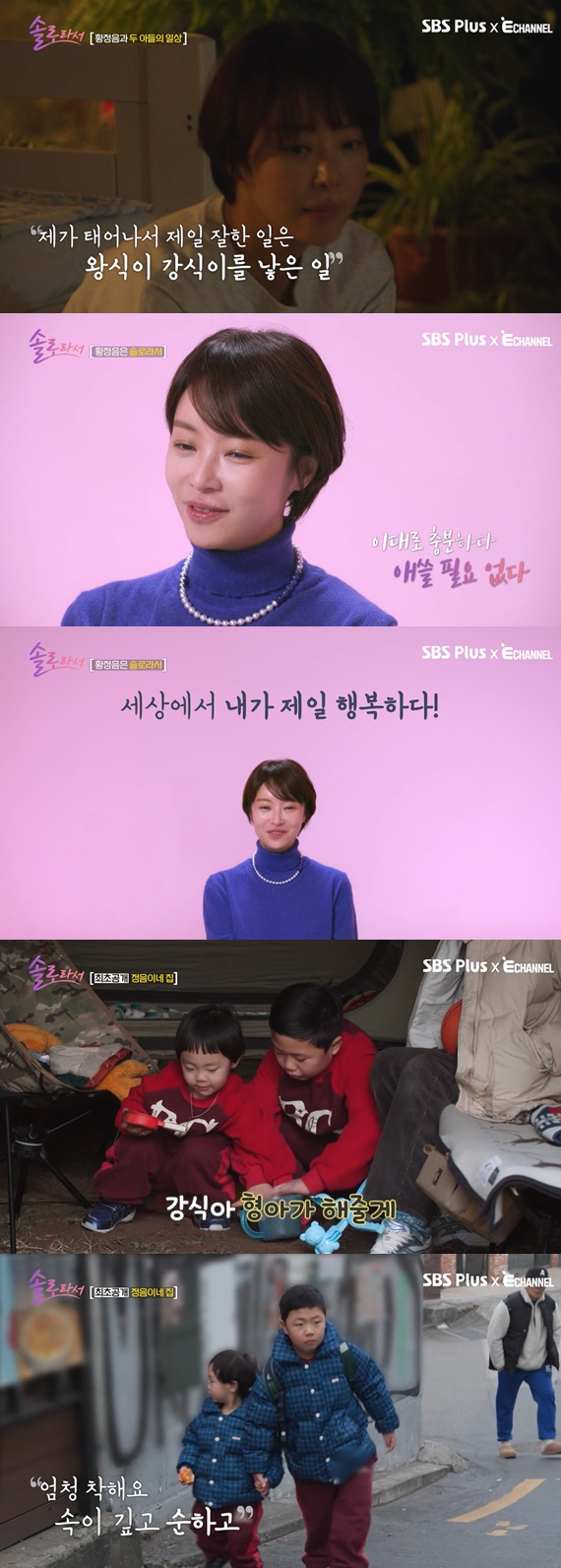 황정음은 두 아들 왕식이 강식이를 키우는 일상으로 눈길을 끌었다. 아들 둘과 함께 거실에서 자다가 일어난 황정음은 엄마와 함께 살며, 엄마의 도움을 받아 아들 둘을 키웠다. 홀로 힘든 일상에도 아이를 바라보는 눈에서는 꿀이 뚝뚝 떨어졌다. 다정하고 착한 첫째 왕식이와 귀여운 애교쟁이 둘째 강식이는 황정음에게 눈에 넣어도 안 아픈 아이들이었다.