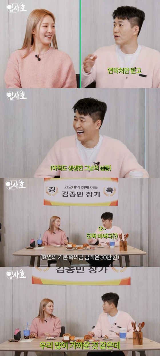 효연은 축의금 기준으로 "일단 제가 간다는 거 자체부터 30만 원, 거기서 많이 가까우면 제 마음으로 더해진다"라고 밝혔다. 그러자 김종민은 "우리 많이 친한 거 같다"고 말해 웃음을 자아냈다.