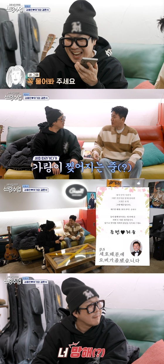 이날 김종민은 절친 하하에게 처음으로 청첩장을 건넸다. 청첩장 내용에는 헤르만 헤세 '내가 만약' 내용 중 일부를 담았고, 이를 본 하하는 "울컥한다"고 결혼을 축하했다.