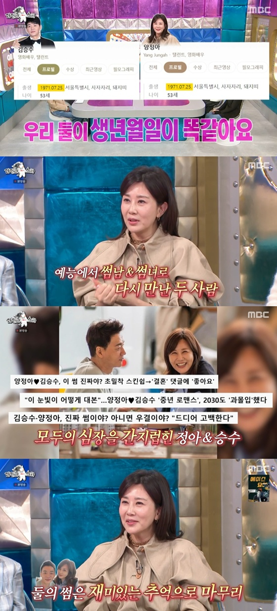 이날 양정아는 "김승수와 생년월일이 똑같다. 4시간 차이로 태어났다. 연예계에서 만나서 같은 작품에서 만났다. 박원숙, 박근형 선생님도 그렇고 '같은 날 태어났는데 잘 만나'라고 할 정도였다"고 말했다.