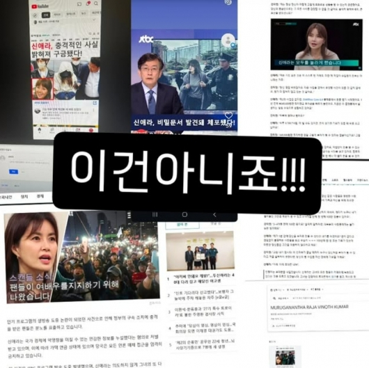 그가 공개한 사진에는 '신애라, 충격적인 사실 밝혀져 구금됐다', '신애라, 비밀문서 발견돼 체포됐다', '스캔들 소식. 팬들이 여배우를 지지하기 위해 나왔다' 등 딥페이크를 이용한 가짜뉴스가 담겨 있다.
