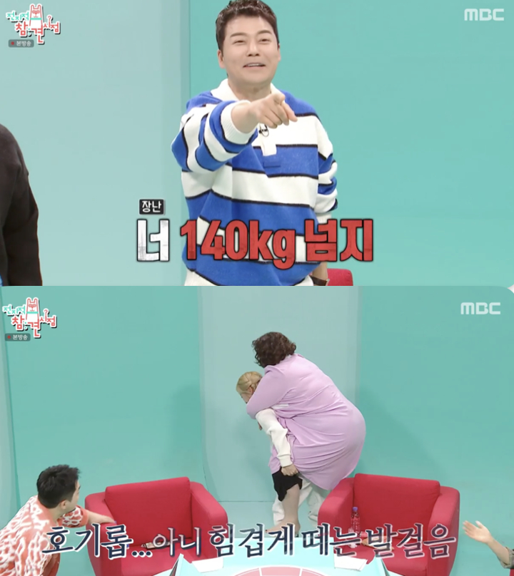 한편 심으뜸은 호기롭게 신기루 업기에 도전했다. 그러나 몇 걸음 떼지 못하고 얼굴을 붉히며 바닥에 주저앉았다. 이를 본 전현무는 신기루에게 "너 140kg 넘지"라며 의심해 현장을 웃음바다로 만들었다.