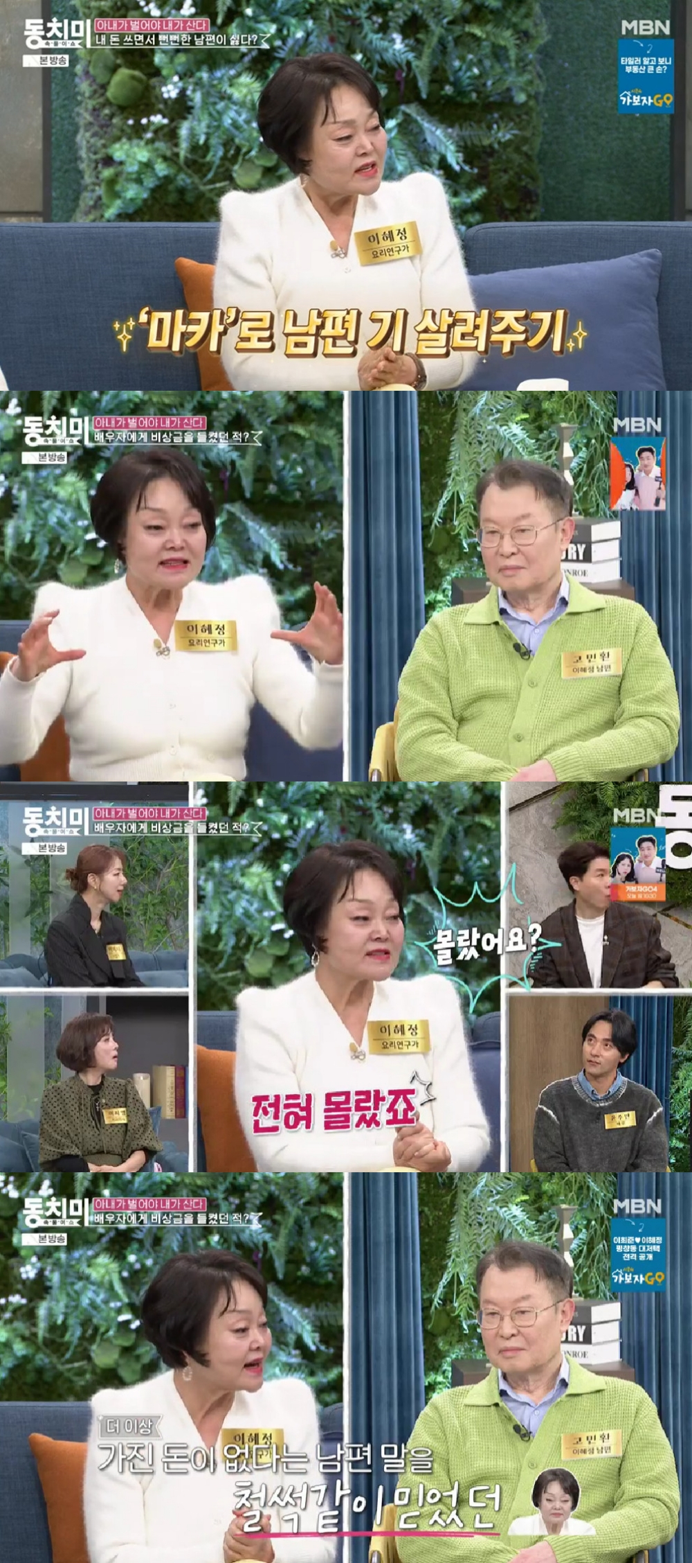 이날 이혜정은 "저는 결혼 초 돈을 받아 쓰다가 직접 돈을 벌기 시작하니 남편 버는 돈은 돈 같지도 않더라. 교수 월급이 얼마 안 된다. 제가 요리 수업 하나만 하면 버는 돈이더라"라며 " 어느 순간 남편이 집에서 굉장히 작아 보이더라. 돈을 버는 족족 줬는데 마음껏 못 쓰더라"라고 밝혔다.