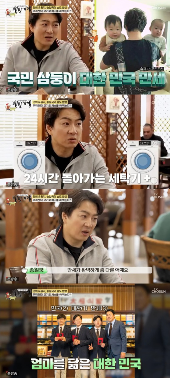 세쌍둥이 아빠인 송일국은 육아에 대한 대화도 나눴다. 그는 "우리 집에 세탁기가 두 개인데, 그 두 개가 거의 24시간 돌아갔다. 분유는 하루에 한 통씩, 기저귀는 하루에 한 팩씩 날라갔다"고 밝혔다.