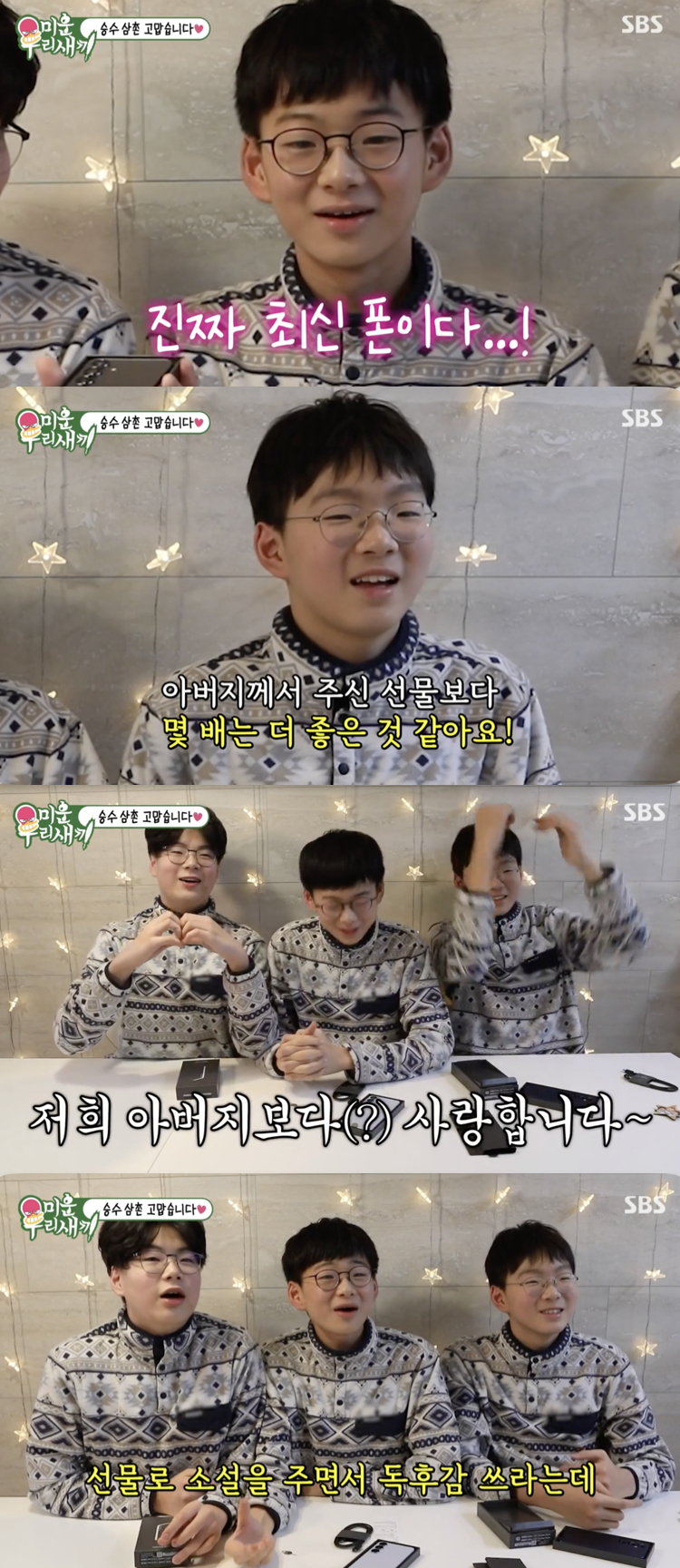 '미운 우리 새끼'에서 송일국의 아들 대한, 민국, 만세가 최신폰을 선물로 받았다.