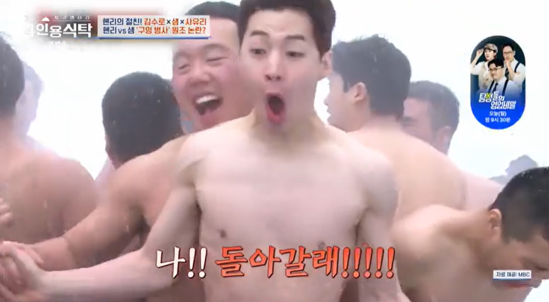 헨리는 '진짜 사나이' 촬영 당시를 떠올리며 "얼음물에 들어가라고 해서 미친 거 아니냐고 생각했다. 이후에 회사에게 '나는 절대 다시 안 간다'라고 했다"고 밝혔다. 이에 김수로가 "우리 매니저가 '진짜 사나이' 촬영 스케줄이 한 주 미뤄질 수 있다고 하더라. '헨리가 도망갔대요'라고 했다. 왜 찜질방으로 도망갔냐"라고 물었다.