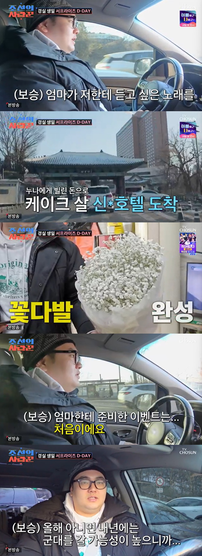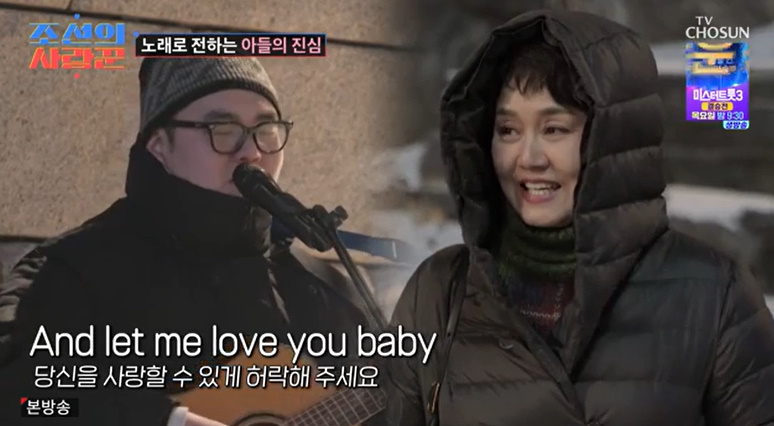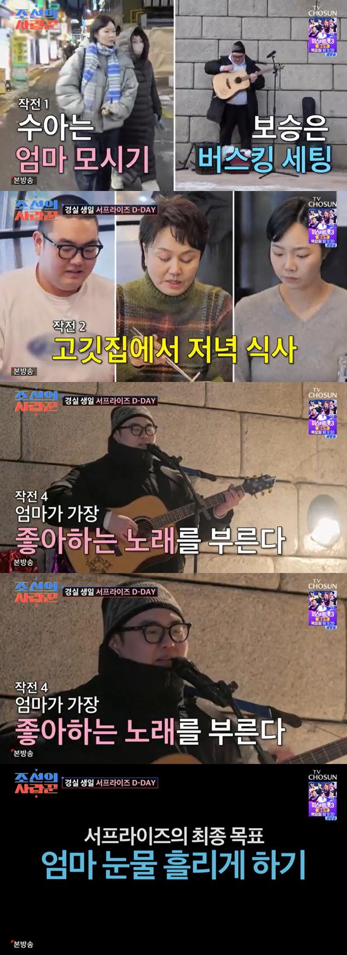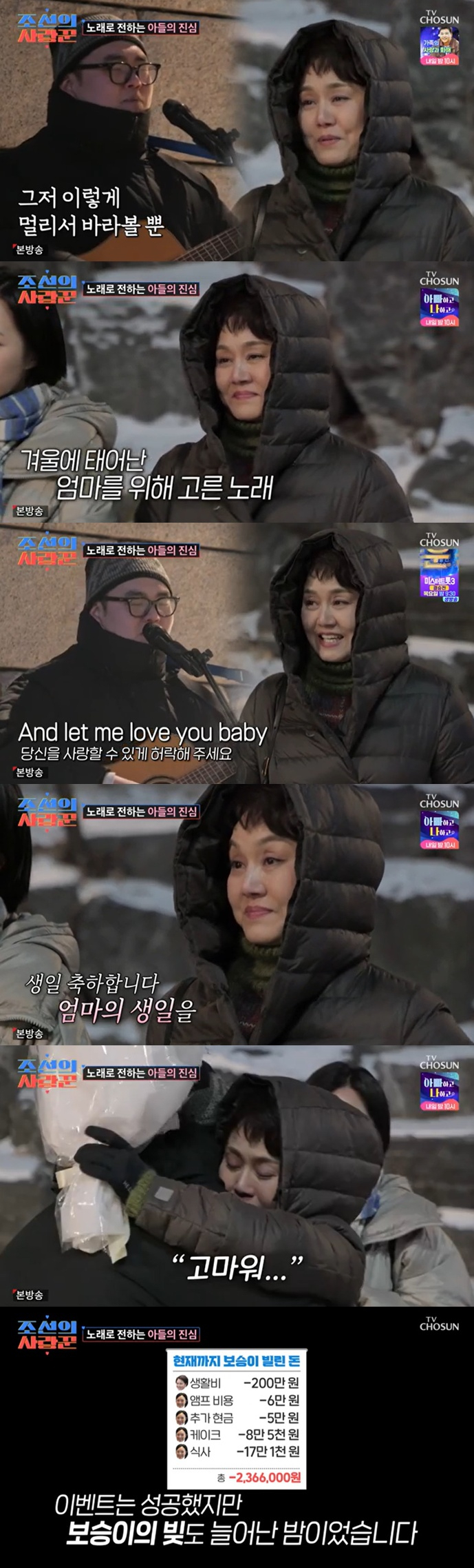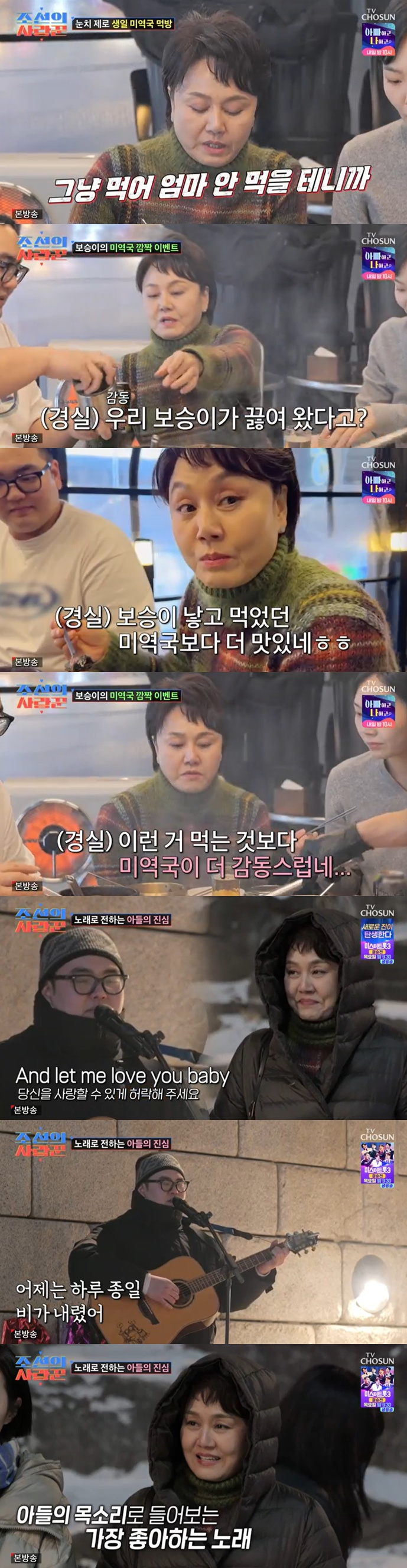 손보승은 화장실에 가는 척 버스킹 장소로 먼저 이동해 누나와 엄마를 불렀다. 손보승은 이경실이 좋아하는 곡 김광석의 '사랑했지만'과 생일 축하송을 부르며 이경실의 눈물을 자아냈다. 두 모자를 지켜보던 손수아도 옆에서 눈물을 흘렸다.