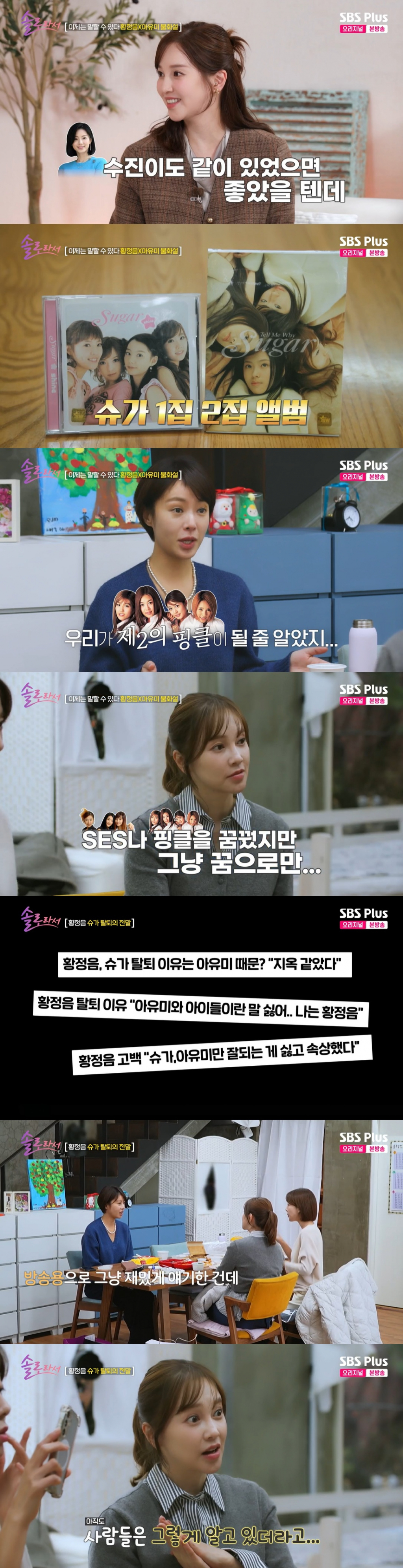 11일 오후 방송된 SBS Plus·E채널 '솔로라서'에서는 걸 그룹 슈가 멤버 아유미, 육혜승을 '정음 하우스'로 초대해 20년 만에 '슈가 재결합' 무대를 선보이는 황정음의 모습이 그려졌다.