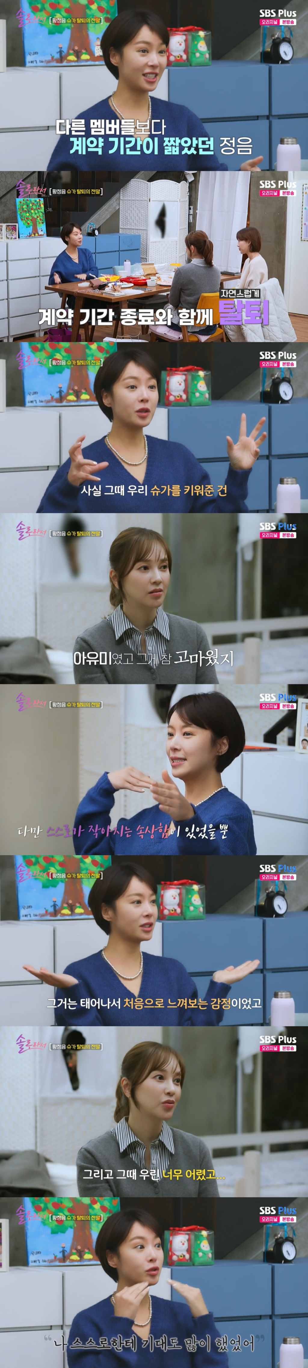 황정음은 "사실 우리만 아는 거지만 난 그때 3년만 계약했었다. 계약 기간이 끝나서 자연스럽게 탈퇴한 거다. 재계약을 안 했을 뿐"이라면서 "우리 슈가를 키워준 건 아유미여서 너무 고마워했고 그 고마움 속에 스스로가 작아지는 속상함이 있었을 뿐이다. 그거는 태어나서 처음 느껴보는 감정이었고 그걸 감당하기엔 내 그릇이 크지 않았다. 또 너무 어렸다. 나 스스로한테 기대도 많이 했다. 근데 내 기대보다 이하니까 너무 속상한 거다. 그래서 재계약을 안 한 것 뿐이다"라고 고백했다.