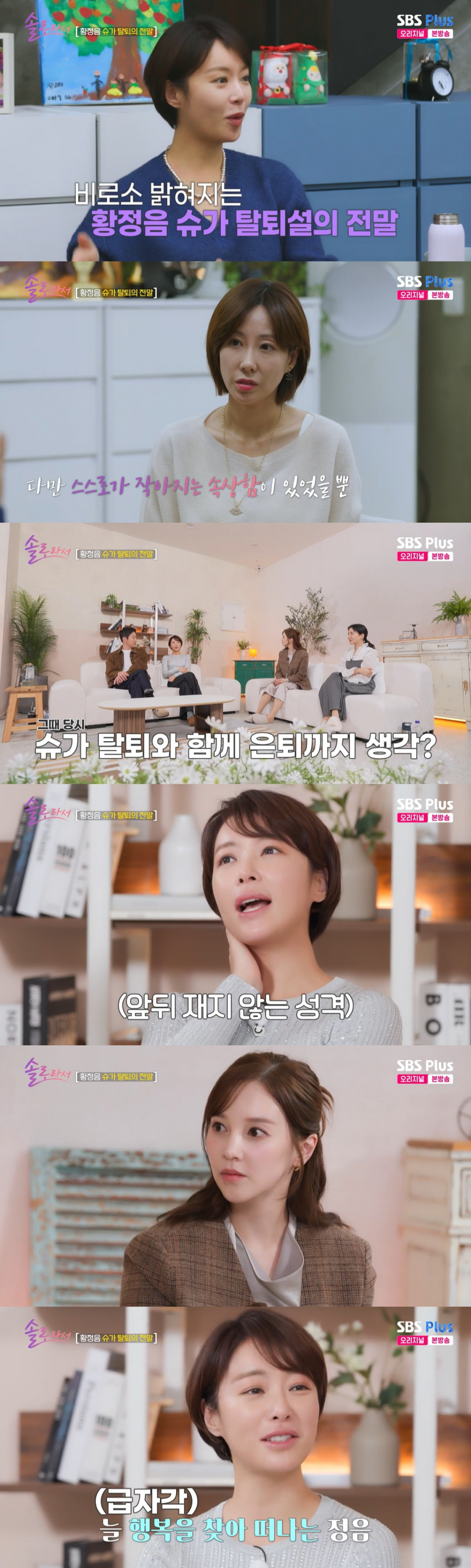 뿐만 아니라 황정음은 '슈가 탈퇴와 함께 은퇴까지 생각했나'라는 신동엽의 물음에 "난 항상 앞뒤를 재지 않는 성격이었다. 하고 싶은 걸 하는 성격이다. 그리고 해결한다. 엄마도 '연예인 안 해도 되니까 하기 싫으면 그냥 나와'라고 했다. 내가 너무 힘들어하니까. 난 항상 행복을 찾아 떠난다"라고 대답하며 밝게 웃었다.