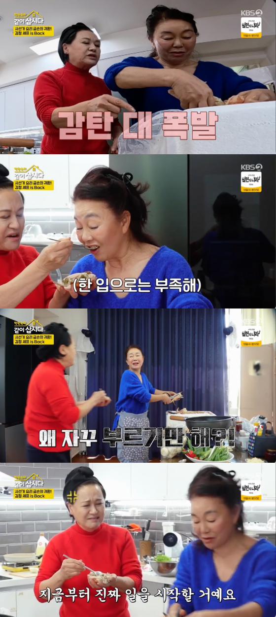 김청은 직접 대게 손질에 나서며 요리 준비에 열을 다했다. 그때 일손이 부족하자 박원숙을 불렀고, 일을 알려주기 시작했다.