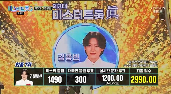 최종 1위의 주인공은 바로, 김용빈이었다. 실시간 문자 투표는 가장 많은 44만 3256표로 1200점 만점을 획득했다. 이에 그는 총 2990점이라는 높은 점수로 '진'으로 올라섰다.