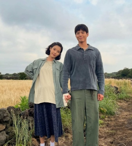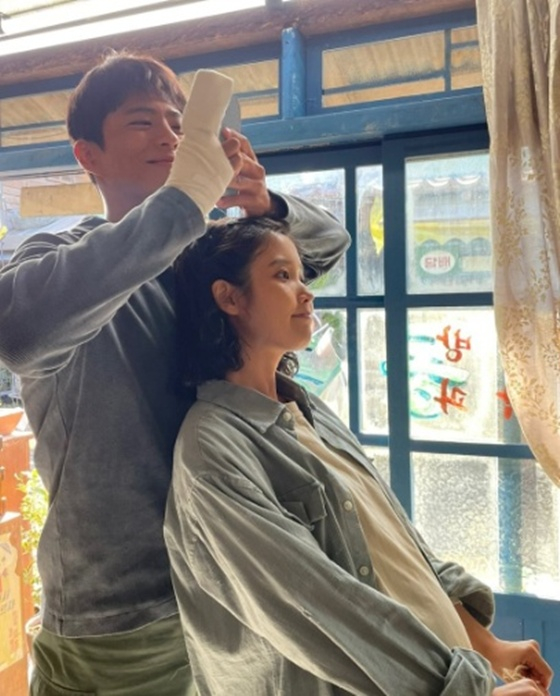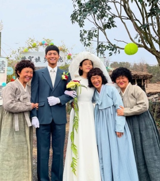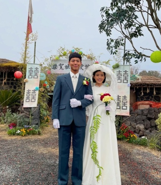 공개된 사진 속에는 '폭싹 속았수다' 비하인드 사진이 담겼다. 오애순 역의 아이유와 양관식 역의 박보검이 결혼식을 위해 차려입은 모습이다. 아이유는 새하얀 드레스를 입고 행복한 미소를 짓고 있다.