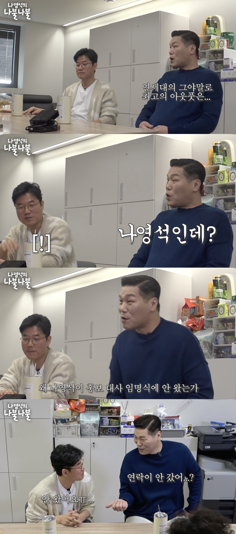 그는 "홍보대사 임명식을 때 의아했던 게 연세대의 최고의 아웃풋은 나영석인데 '왜 나영석이 홍보대사 임명식에 왜 안 왔는가'였다"라며 "연락이 갔는데 본인이 바쁘다고 안 했을 것"이라고 셀프 답을 내렸다.