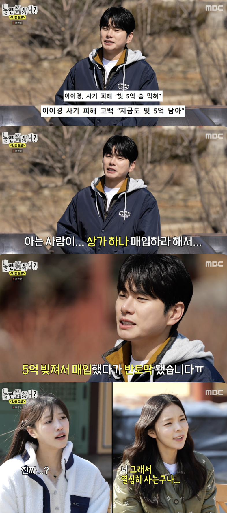 이에 이이경은 당황한 듯 하다가 "아는 사람이 상가 하나 매입하라고 해서 5억 빚져서 매입했다가 반토막 됐다"라고 솔직히 털어놨다. 그러면서 "빚은 있지만 열심히 일하면서 살아가야죠"라고 덧붙였다.
