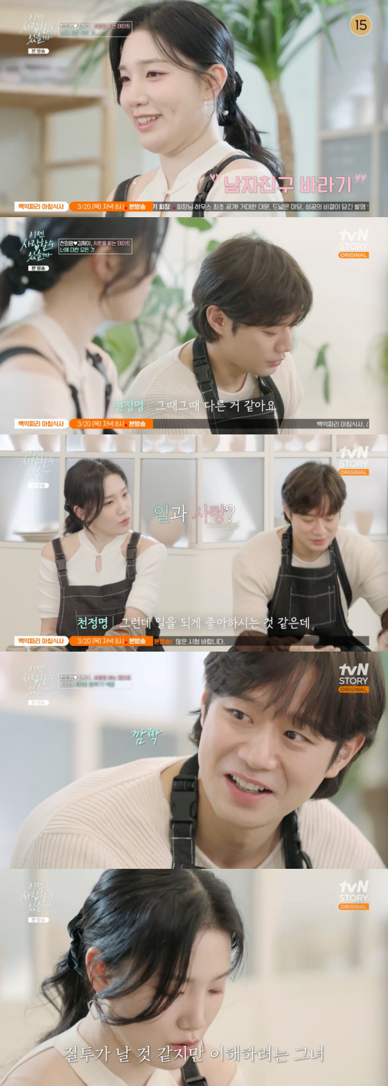 천정명은 김제이에게 "일과 사랑 중 뭐가 더 우선이냐"고 질문했다. 김제이는 "사랑이 먼저"라고 즉답했다.