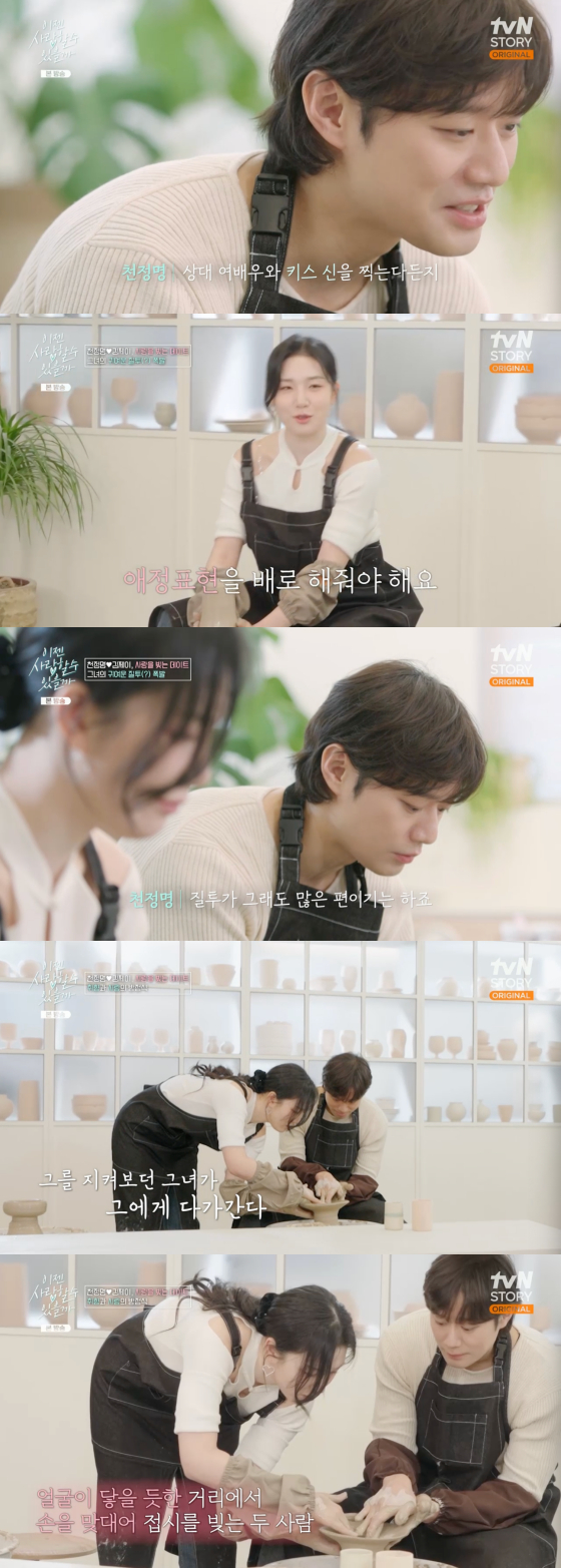 17일 방송된 tvN STORY 예능 프로그램 '이젠 사랑할 수 있을까'에서는 천정명이 한국 무용가 김제이와 도예 데이트를 하는 모습이 그려졌다.