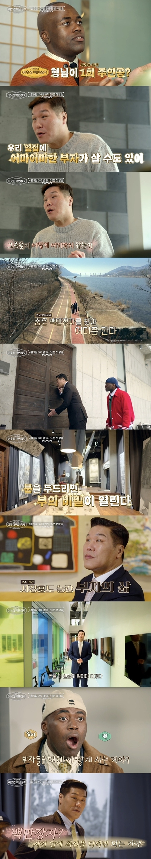 이와 함께 서장훈과 조나단의 첫 만남을 담은 티저가 공개되며 기대감을 증폭시켰다. 조나단은 "부자들을 만나는 프로그램이니 형님이 1회 주인공 아니냐"라며 서장훈의 '재산 2조설'을 언급했다. 서장훈은 "주변에 우리가 모르는 소리 소문 없이 성공한 분들이 굉장히 많다. 진짜 우리 옆집에 말도 안 되게 어마어마한 부자가 살 수도 있다"라며 손사래를 쳤다. 또 서장훈은 "그렇게 크게 성공하신 분들을 직접 만나서 그분들이 어떻게 여기까지 왔는지 알아내는 프로그램"이라며 '이웃집 백만장자'의 취지를 설명했다.